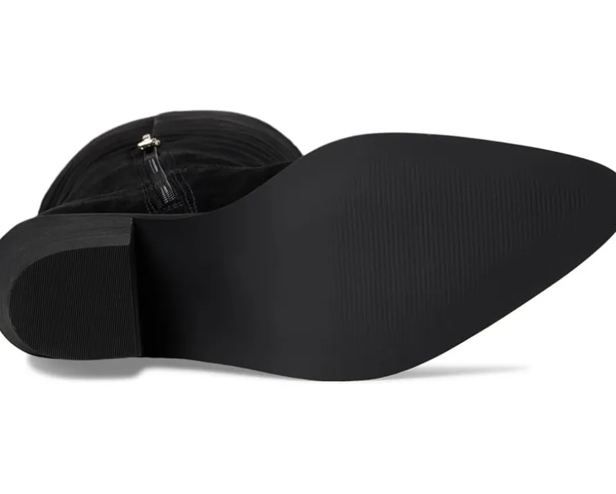- The Sashan by Guess® offers a curved topline knee-high boot in beautiful suede materials. This stacked heel featuring topline stitching mimics Western flair. Made from soft suede upper, polyurethane lining, padded insole, and rubber outsole.