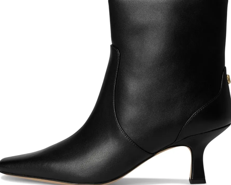 - Refined yet versatile, COACH® Sculpted C Kitten Heel Bootie. Crafted with a smooth leather upper, this bootie delivers timeless polish while the sculpted kitten heel adds just the right amount of lift for chic, all-day comfort. The faux leather lining ensures a smooth fit, while the cushioned rubber insole keeps every step soft and supported. A durable rubber outsole offers reliable traction, making these boots as practical as they are stylish. Designed with a sleek zippered side closure, they slip on effortlessly, creating a streamlined look that pairs seamlessly with everything from tailored trousers to flowy dresses. The sculpted C detail elevates the design with iconic Coach flair, turning these booties into a statement piece for workdays, weekends, or nights out.