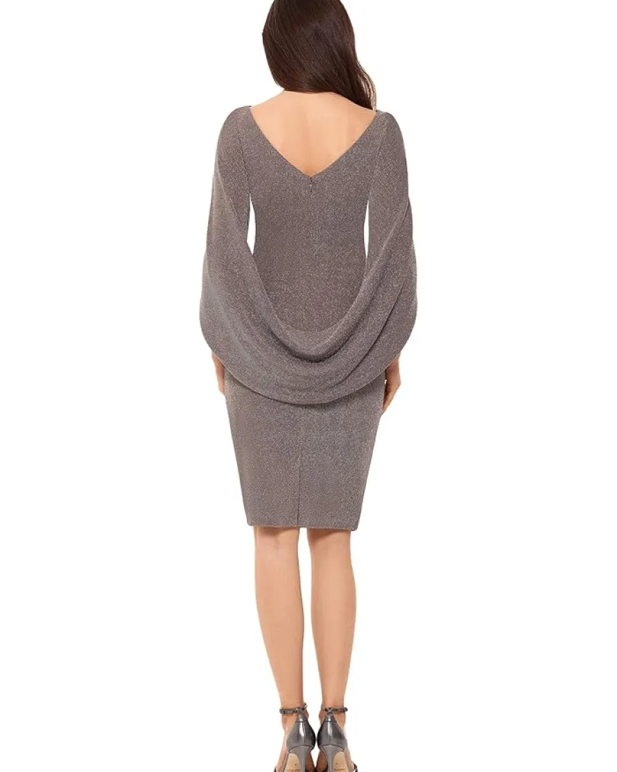 - Fitted dress offers a round neckline and cape-inspired sleeves that drape at back.