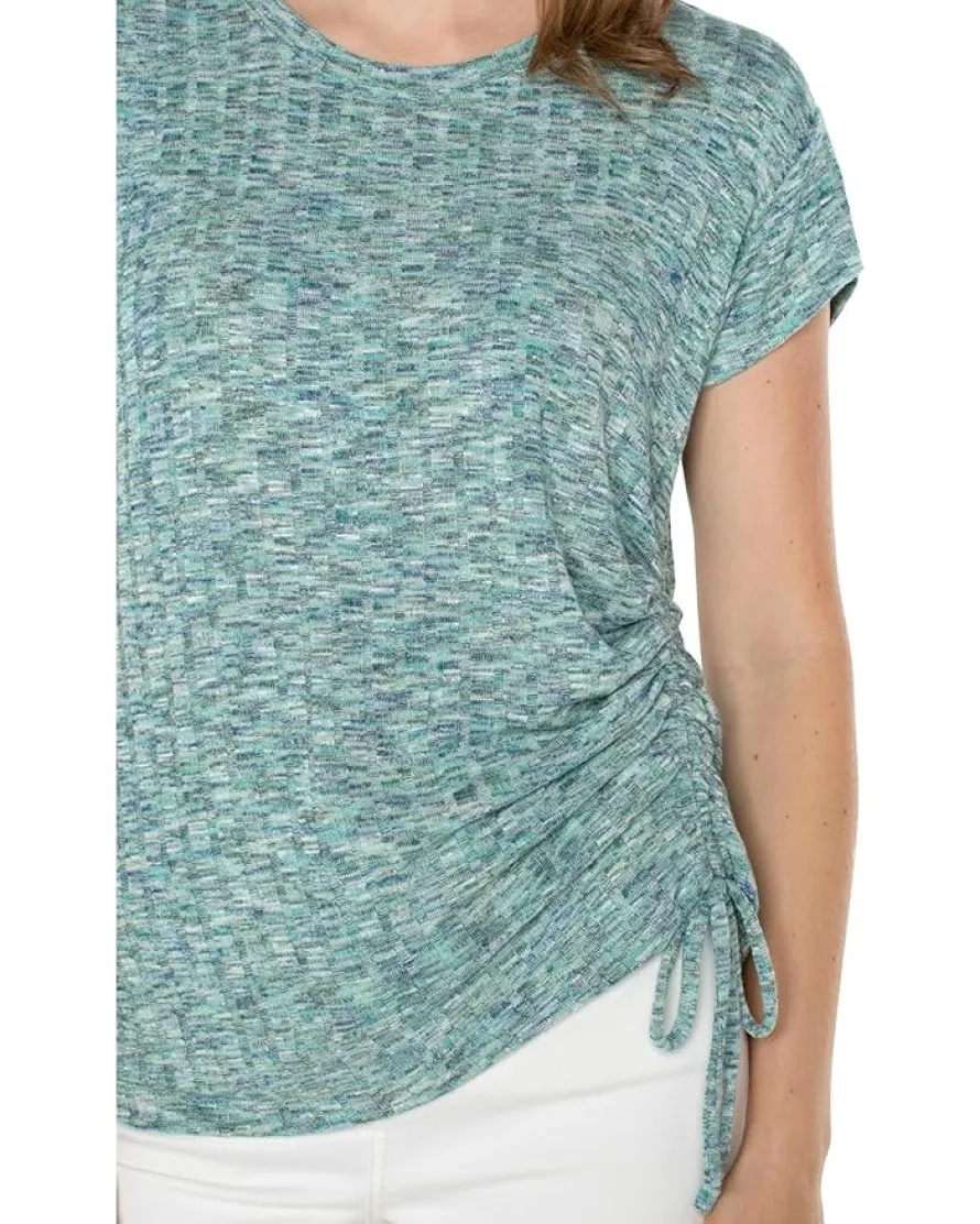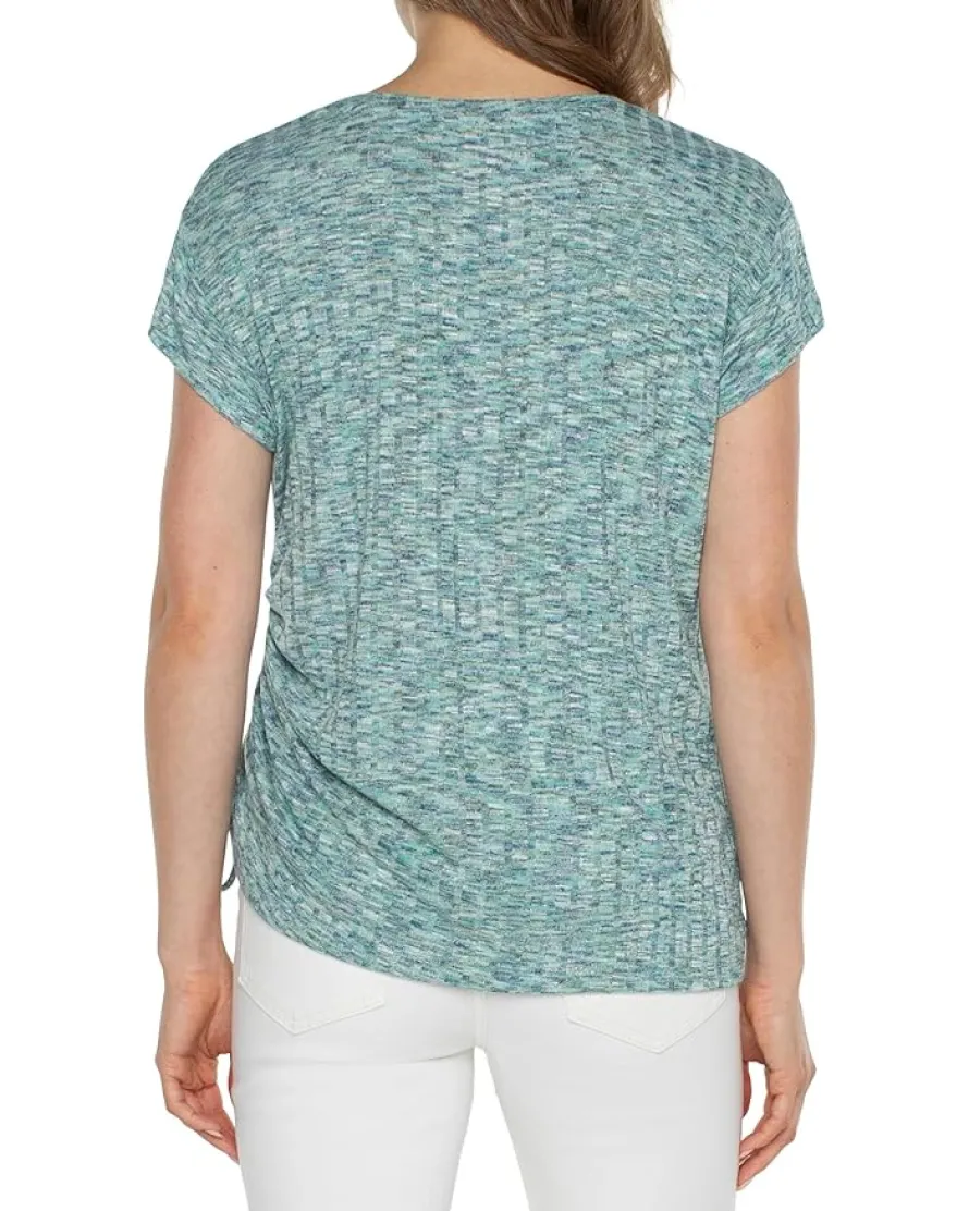 - Elevate your casual closet effortlessly wearing Liverpool™ Los Angeles Short Sleeve Scoop Neck with Side Tie Detail Space Dye Rib Knit, featuring an attractive spacedyed print and side cinch-tie detail. Crafted with a premium spacedye rib knit fabric, the pull-on style top has a scoop neck and short sleeves.