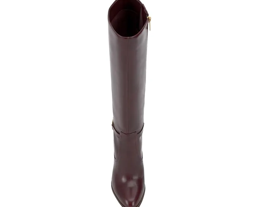 - Walk with sleek poise wearing the Vince Camuto® Skylie Boots. The knee-high footwear embodies heritage with leather upper and logo hardware on the ankle belt. This riding boot inspired style is taken up a notch by its covered, stiletto heel. This classic is constructed with an almond toe, micro platform, and inside zip for easy entry.