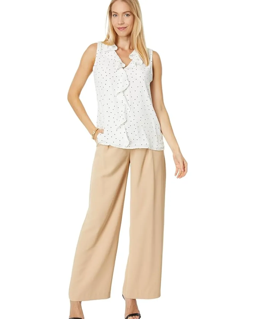 - Look cute and classic wearing the Vince Camuto® Sleeveless V-Neck Ruffle Front Pindot Blouse.