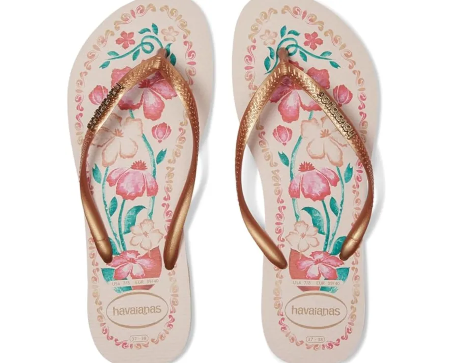 - The Havaianas® Slim Tropical flip-flop has the Slim design you already know, with thinner straps and soles, featuring beautiful Brazilian tropical prints. The sandal also has the metallic Havaianas logo prominently displayed on the straps. Choose the one that suits you best now.