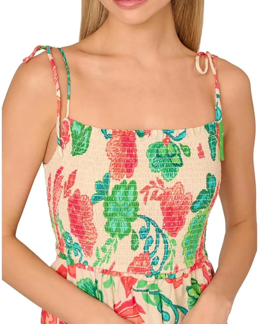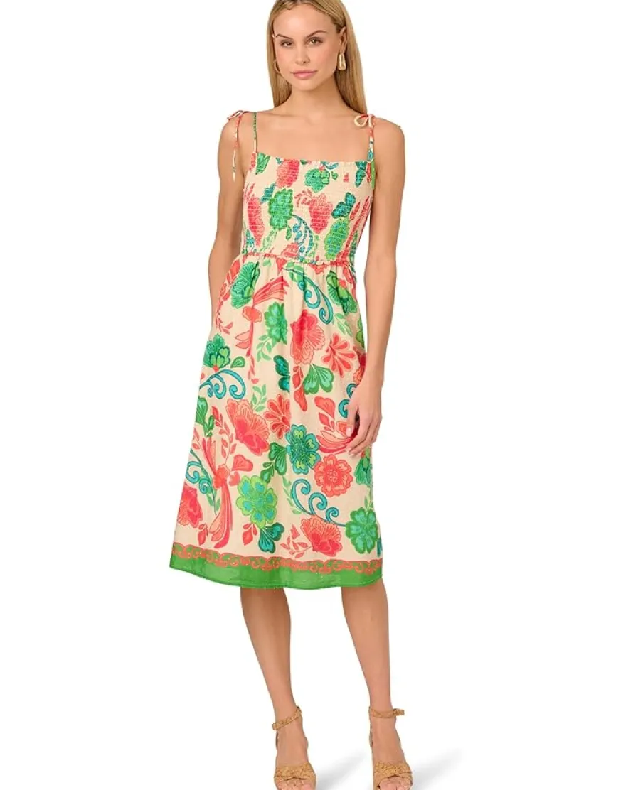 - Exude positive and pretty vibes wherever you go wearing Adrianna Papell® Smocked Printed Placement Dress. The floral printed dress features tie-up shoulder straps, a smocked body, and a knee-length skirt.