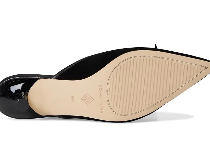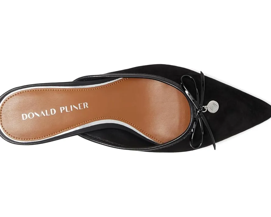 - Discover the Donald Pliner® Soel, where timeless style meets contemporary charm. Crafted from plush black suede, this pointed-toe silhouette features a refined bow detail and sleek tonal trim that effortlessly blends classic charm with contemporary flair. The soft leather upper, lining, and insole offer a luxe feel with every step, while the sculpted kitten heel delivers a flattering lift without sacrificing comfort. Slip-on ease and a Toeflex outsole provide flexible support for day-to-night wearability.