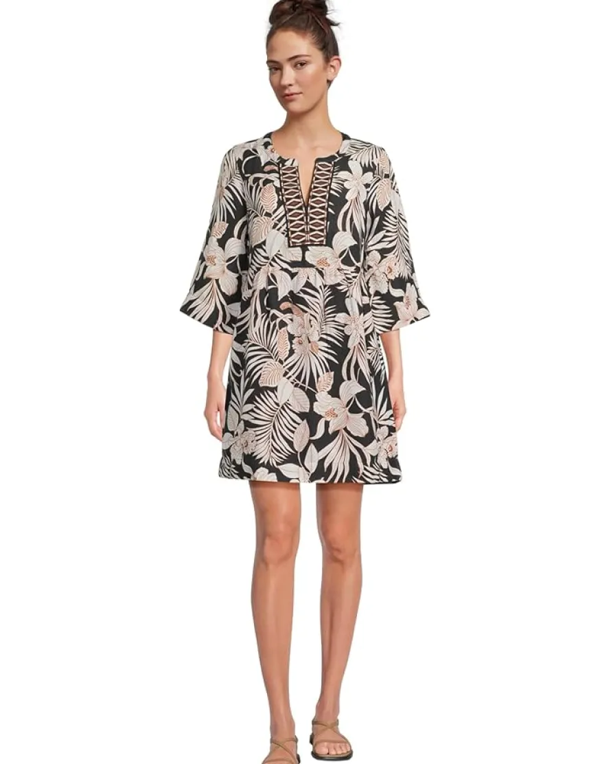 - Slay the style game effortlessly wearing Tommy Bahama® Stamped Lucia Blooms Tunic Dress. The lined, pull-on style dress features a split V-neck, three-fourth sleeves, an allover floral print, side pockets, and an above-the-knee silhouette.