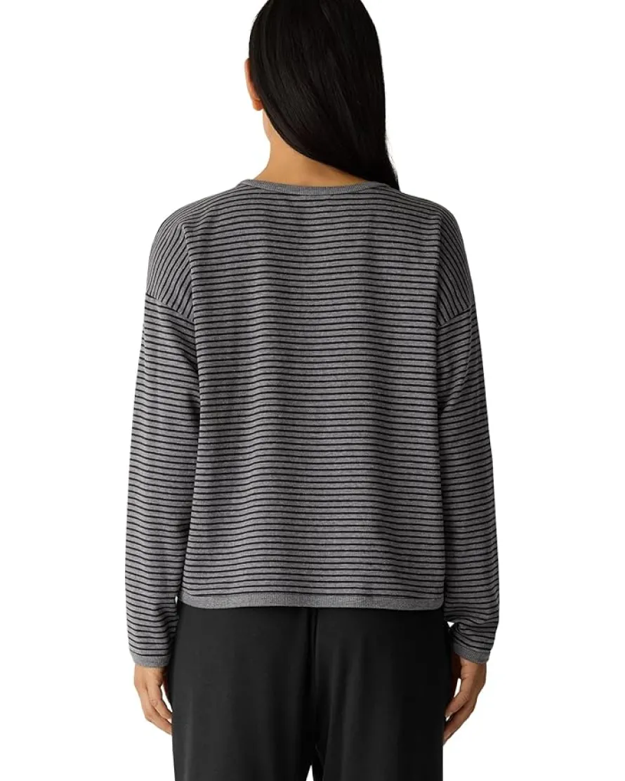 - This is the top your wardrobe has been waiting for, the Eileen Fisher Striped Cozy Brushed Terry Round Neck Cropped Box Top. Designed in a classic fit with long sleeves and a round neck, it delivers a timeless silhouette that flatters with ease. What makes it extra special? The striped pattern on one side and solid design on the other, giving you two stylish looks in one. Its lightweight, relaxed feel paired with a softly rippled texture ensures you stay cozy while looking elevated. Cropped just right, it layers beautifully over high-waisted pants or skirts, making it perfect for work-to-weekend dressing.