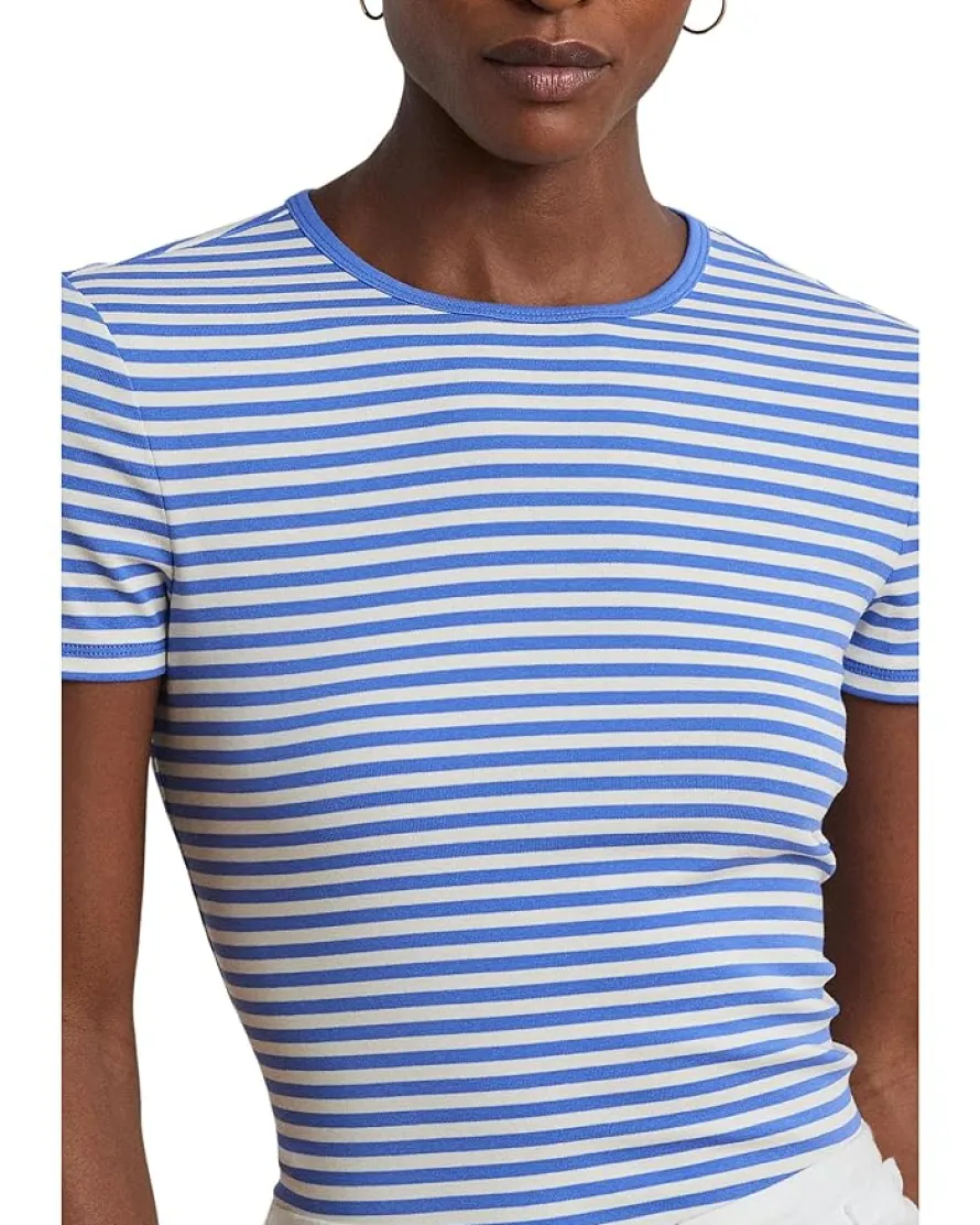 - Exude style on an everyday basis wearing the comfy Lauren Ralph Lauren® Striped Stretch Cotton Crewneck Tee. Yarn-dyed with timeless horizontal stripes, this essential regular-fit tee is made with lightweight stretch cotton for a soft hand. The pull-on style tee features a crewneck, short sleeves, and a straight hem with an “LRL”-embroidered logo at the right hem. It is intended to hit at the hip.