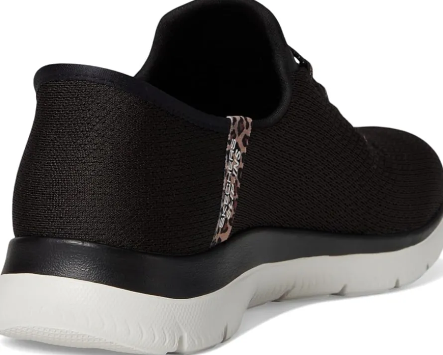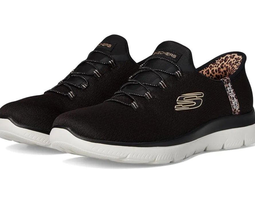 - Step into effortless style donning the SKECHERS® Summits Leopard Chic Hands Free Slip-INS! With their bold leopard print and hands-free design, these slip-ons blend comfort and trend effortlessly. Featuring a rubber upper, insole, and outsole, they’re durable and flexible, while the mesh bungee design allows for easy on and off. The unlined construction enhances breathability, keeping your feet cool all day. Plus, these eco-friendly shoes are vegan, so you can feel good about your choice. Equipped with Air-Cooled MF® technology and a Heel Pillow™, your feet will enjoy all-day cushioning and support.