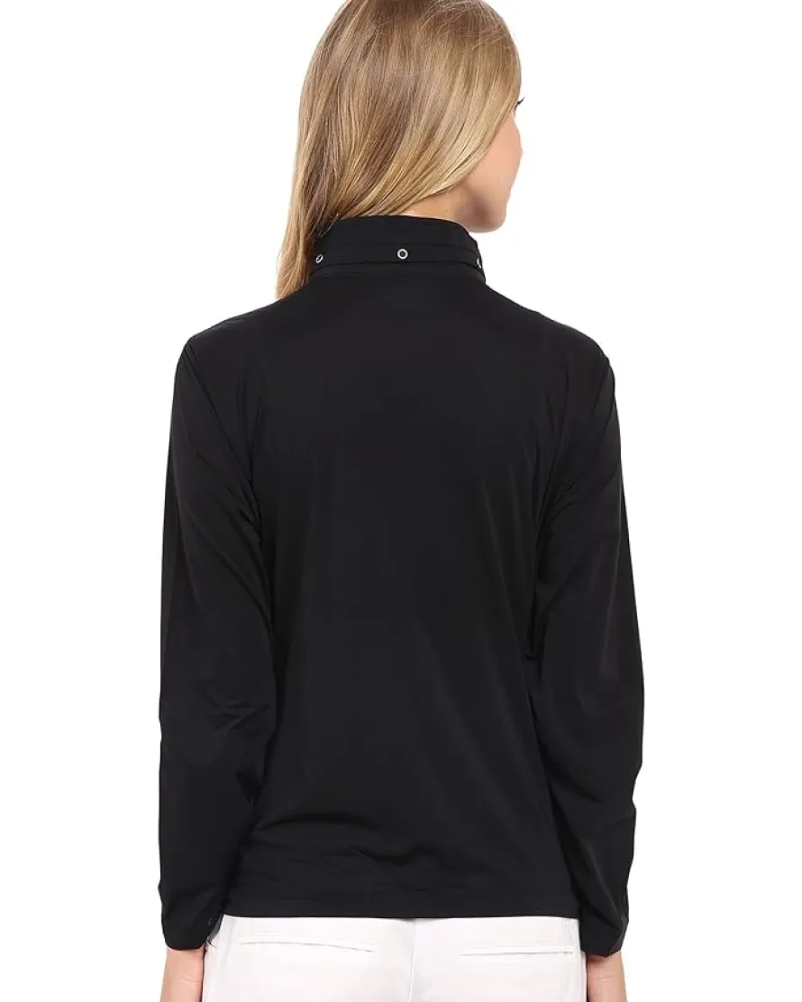• Solid colorways appear more sheer and provide versatile layering options. - Stand collar for increased coverage.