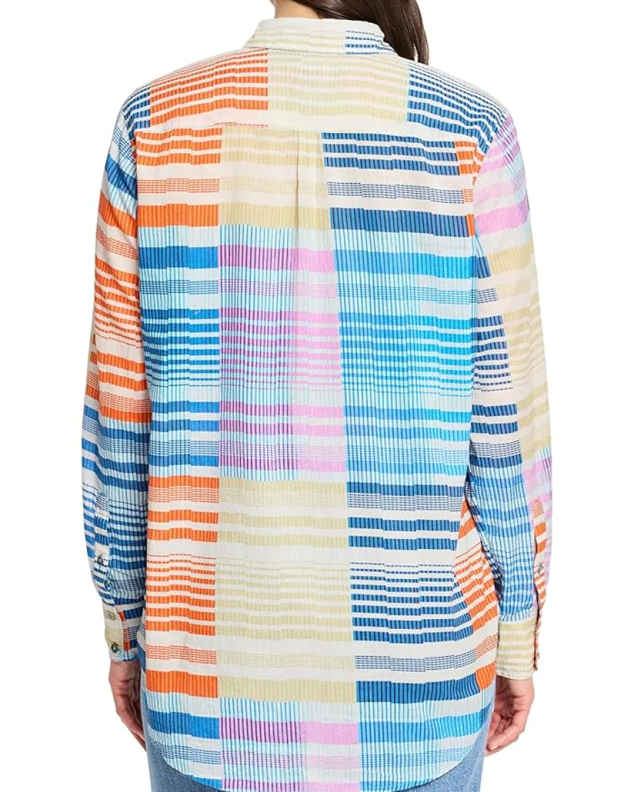 - More than just a pattern, you’ll love the intentionally rumpled texture of NIC+ZOE™ Sunset Stripe Cotton Boyfriend Shirt that adds a new dimension to the all-day comfort of cotton. We gave it a classic button front, a relaxed fit, and a hem with a little extra length, designed to go with your flow. It features a collared neck, long sleeves with buttoned cuffs, tie up detail at the hem, and an exquisite allover print.