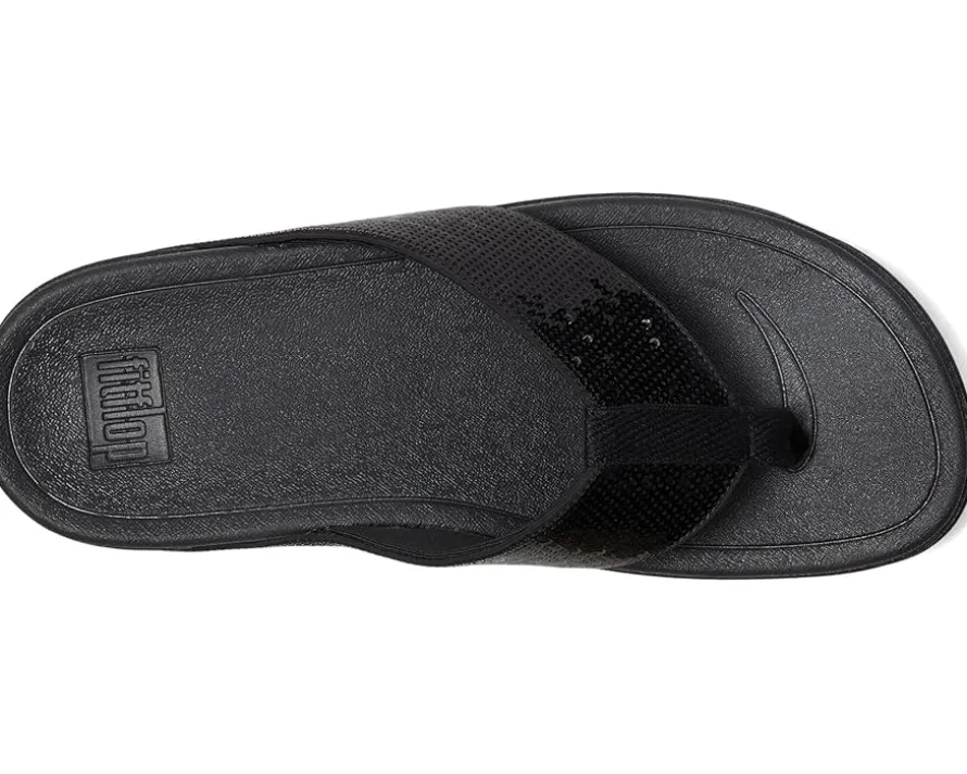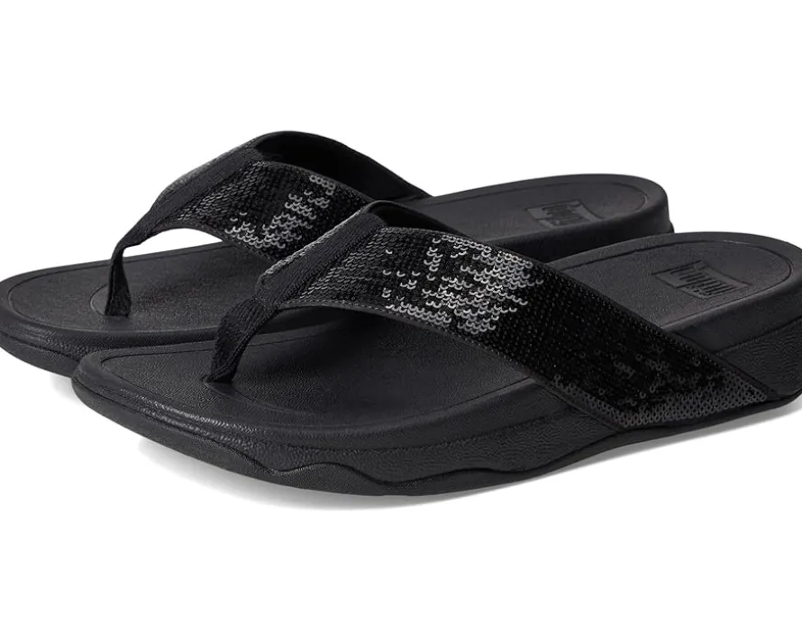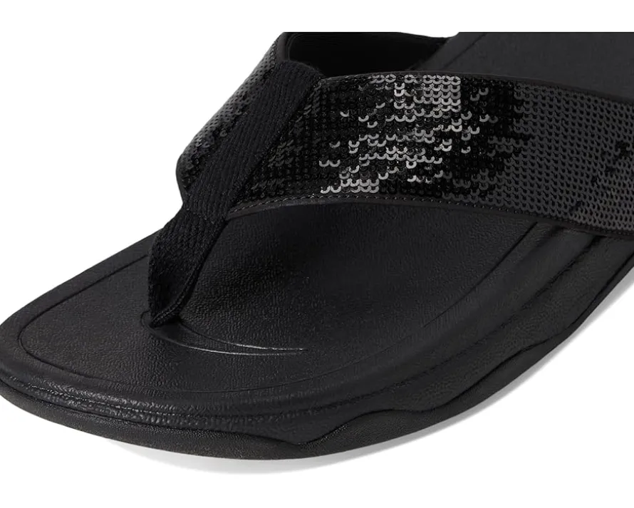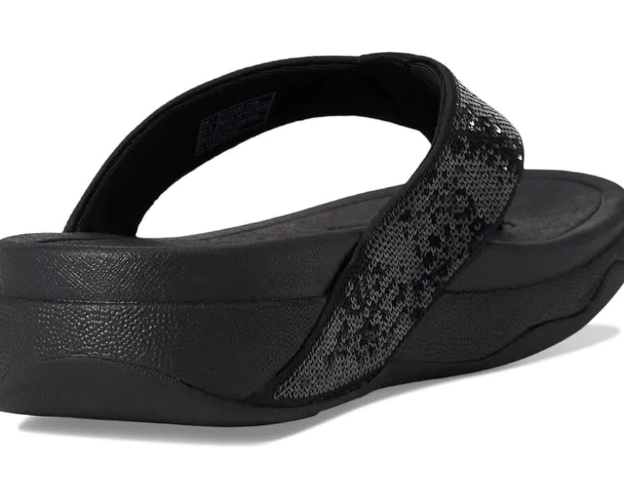 - Redefine your everyday footwear wearing the FitFlop™ Surfa Sequin Toe-post Sandals. Designed with recycled webbing drenched in fine, close-set sequins, these sandals bring a touch of luxe to every step-whether you’re beach-bound, festival-ready, or strolling from sunrise to soiree. The soft polyester upper and lining hug your feet comfortably, while the fabric toe-post keeps it breezy. Slip on with ease and let the wedge heel and signature Microwobbleboard™ midsoles cushion your every move.