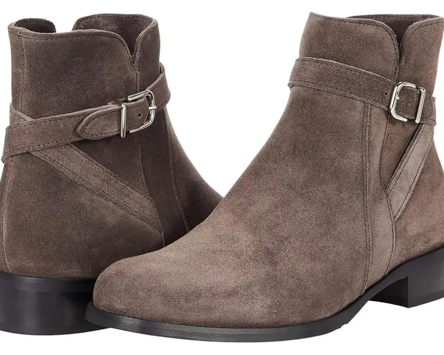 - A buckled strap adorns the ankle, with a soft square toe silhouette.