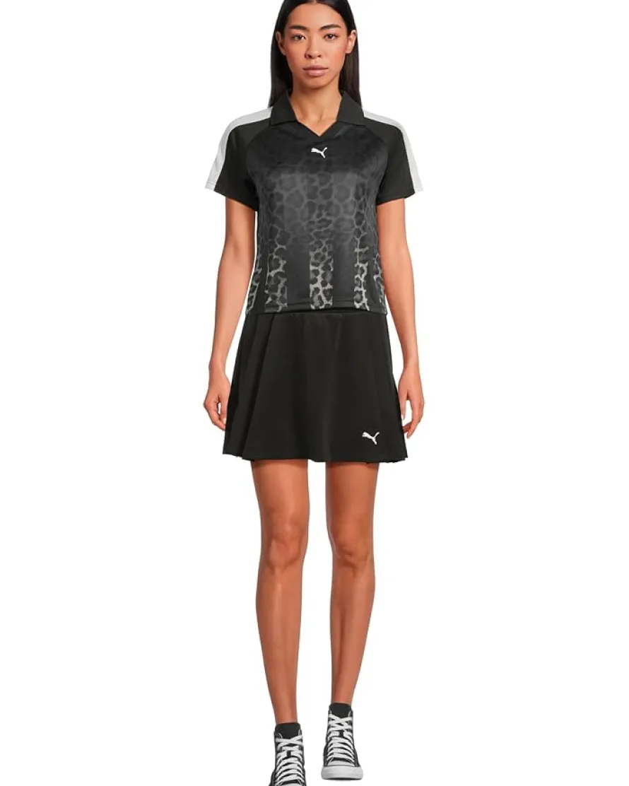 - Elevate your style choosing the PUMA® T7 Leo Luxe Relaxed Soccer Jersey, featuring sporty T7 panel inserts, a bold all-over animal print, and the iconic PUMA Cat Logo in rubber print on the chest. Perfect for adding a trendy and eye-catching flair to your outfit. It has a crew neckline, short sleeves, and a straight hem.