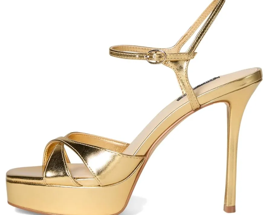 - Fall in love with the Nine West® Tates dress sandals. Featuring an open square toe, high stiletto heel, and criss-cross straps, this sandal is sure to impress and the perfect wardrobe staple! It is crafted with a faux patent leather upper, polyurethane lining, and a cushioned insole.