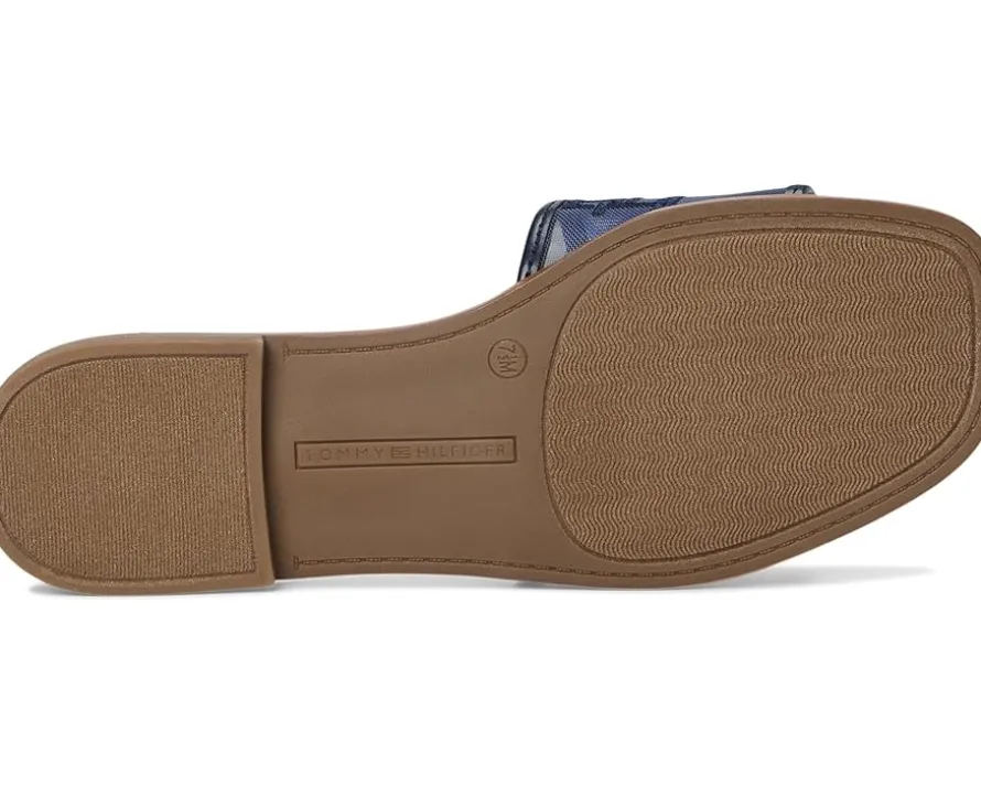 - The Tommy Hilfiger® Tesia Sandal with a mesh upper and signature logo detail amplifies the modern allure of a minimalist slide flat sandal, giving it breathability and a fresh look. The slip-on style sandal features a foam footbed for ultimate comfort and the slight block heel adds a little height to your look.