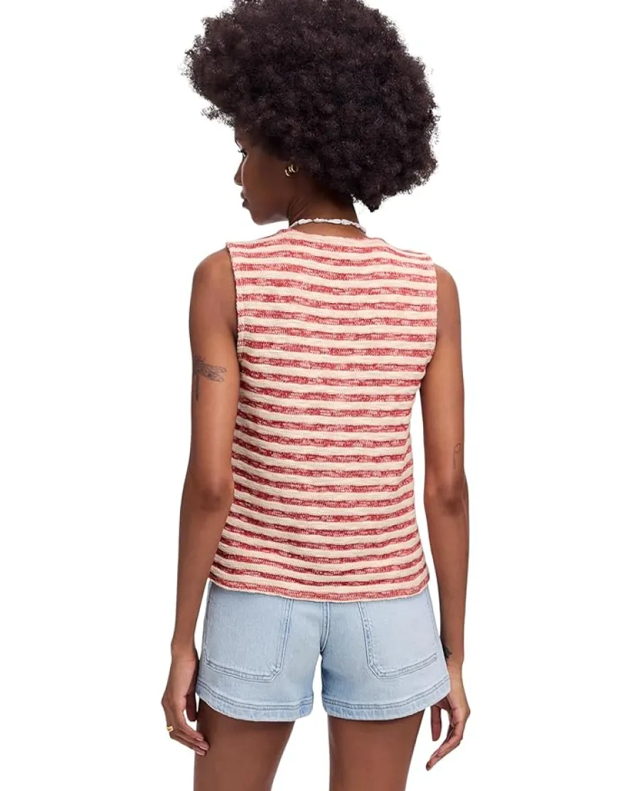 - Look bold, balanced, and beautiful wearing the Madewell® Texture Bacopa Vest. It features crew neckline, sleeveless style, regular fit, allover striped pattern, and straight hem.