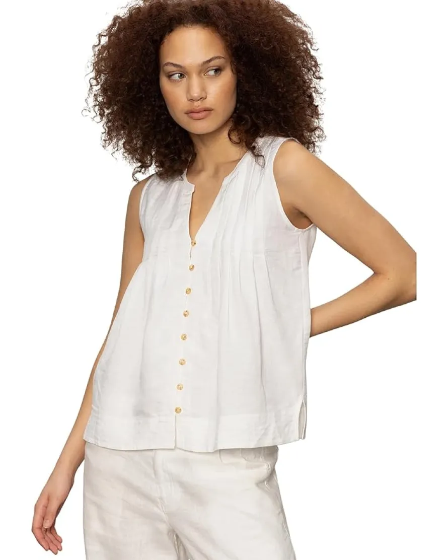 - Effortlessly chic and endlessly wearable – meet your new warm-weather go-to: the Sanctuary™ Harmony Tank. Designed with a modern classic fit, this sleeveless staple features a flattering V-neck and elegant pleat details at the chest that add subtle texture and visual interest. The button front design gives it a timeless twist, while the easy pull-on style keeps things comfy and carefree.