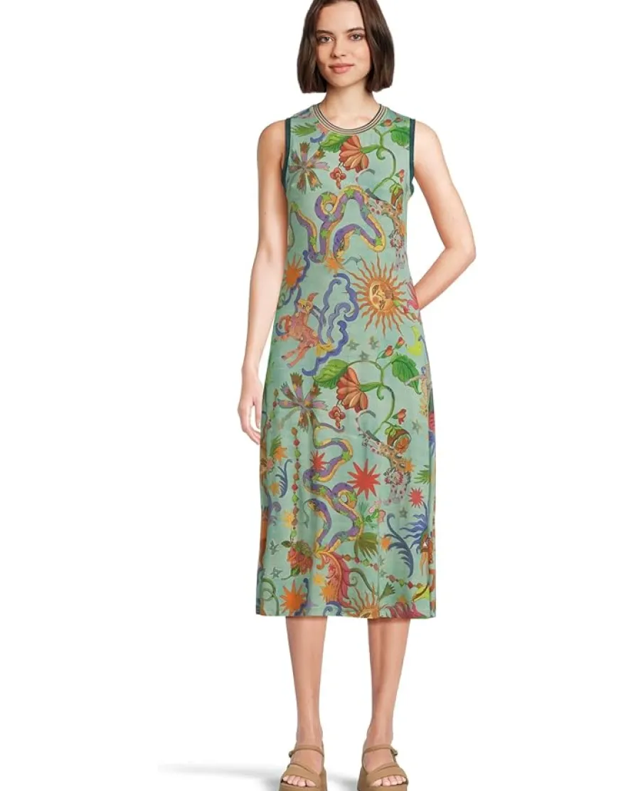 - Whimsical and full of wonder, the Johnny Was® The Janie Favorite Knit Tank Dress- Kayla features a vibrant, storybook-inspired print with suns, florals, and fantastical creatures dancing across a dreamy pastel backdrop. The streamlined silhouette and central stripe detailing add a playful structure to the flowy fit, making it perfect for sunshine-filled days, vacations, or creative outings. Just slip it on and let the magic follow.