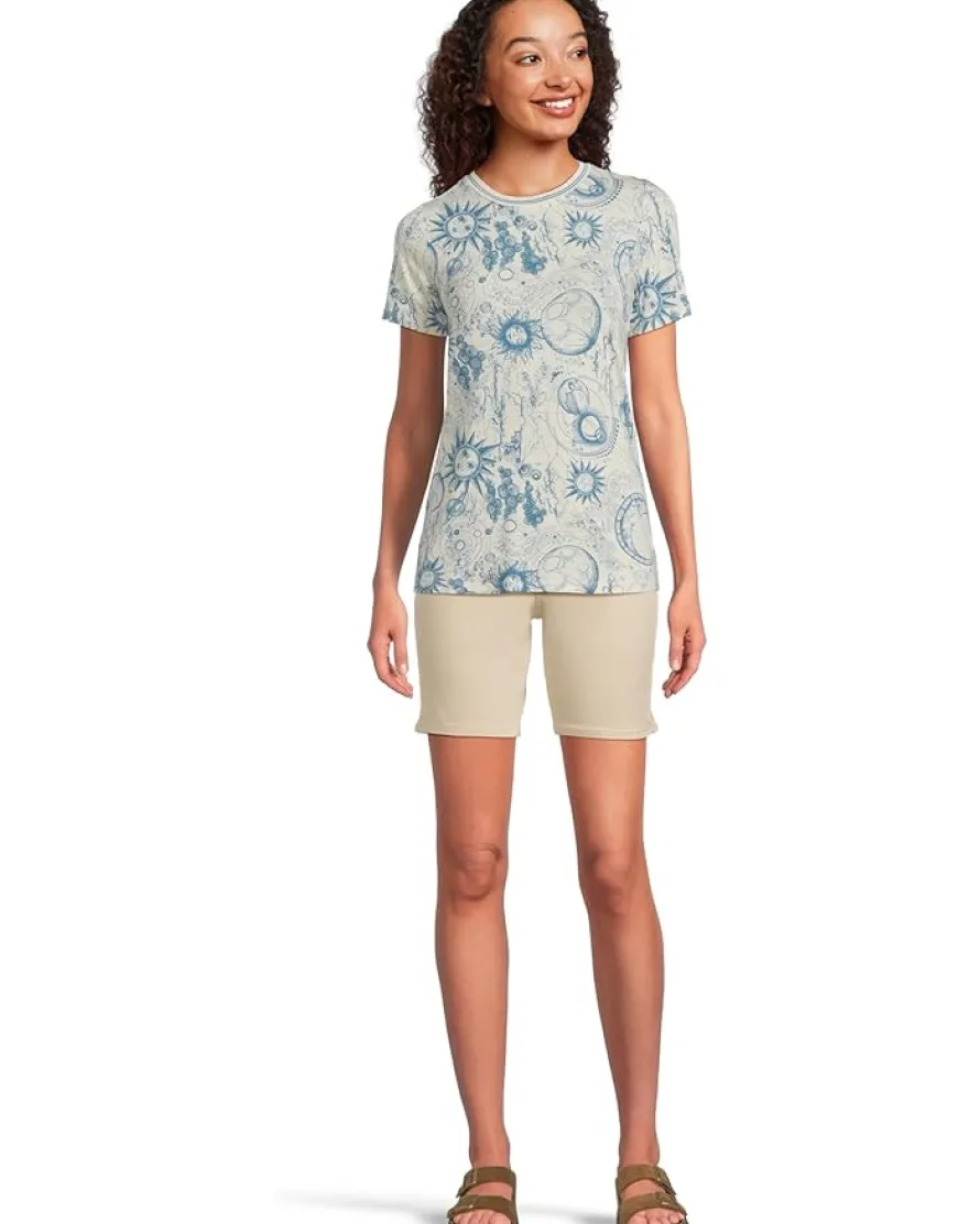 - Delicate and dreamy, the Johnny Was® The Janie Favorite Short Sleeve Crew Neck Tee- Min features an allover toile-inspired print of celestial suns, moons, florals, and natural motifs. The classic crew neck and tailored fit give it a polished yet easygoing feel, perfect for layering or wearing solo. It’s a versatile piece that brings a touch of magic to your everyday wardrobe.