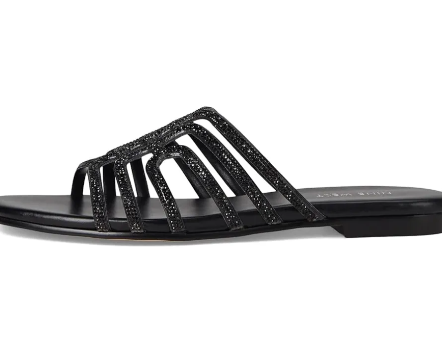 - Complete your look in the Nine West® Timy dress flats. They feature a modern square toe shape, strappy silhouette, and embellishments on the straps. These slide sandals are made of a polyurethane upper, cushioned footbed, and polyurethane lining. These flat sandals are anything but boring and sure to impress.