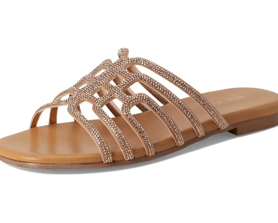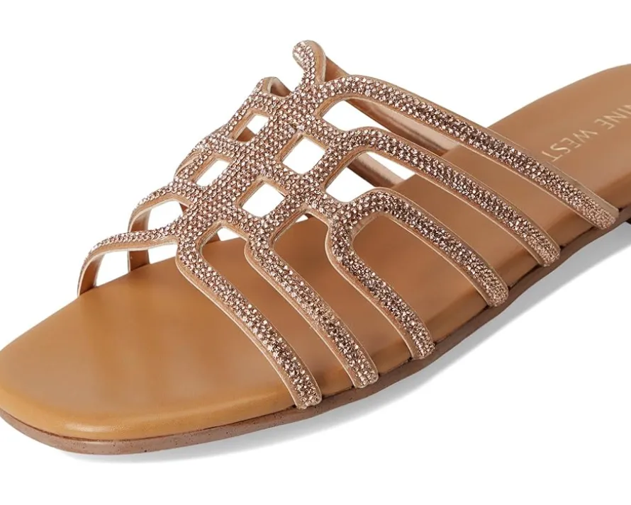 - Complete your look in the Nine West® Timy dress flats. They feature a modern square toe shape, strappy silhouette, and embellishments on the straps. These slide sandals are made of a polyurethane upper, cushioned footbed, and polyurethane lining. These flat sandals are anything but boring and sure to impress.