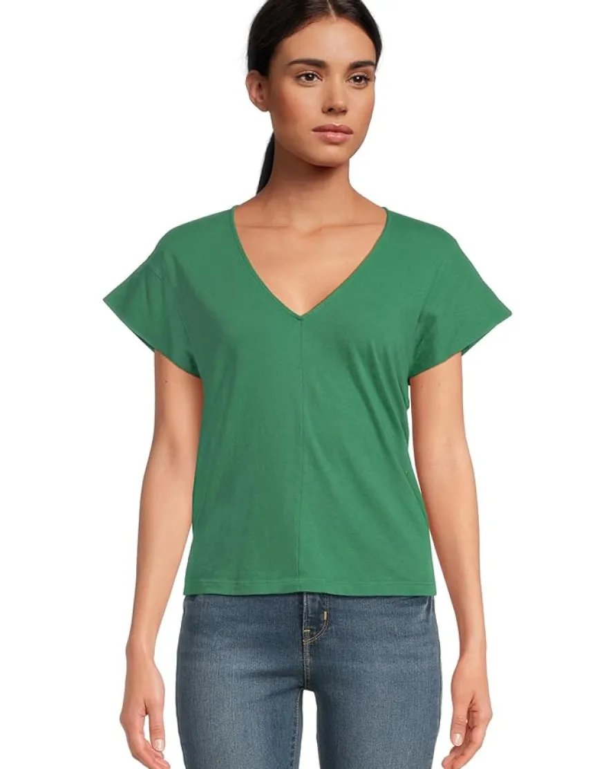 - Elevate your casual style in the Michael Stars™ Tobi V-neck Tee. This pull-on style top features a V-neckline with cap sleeves, straight hemline and a classic fit silhouette.