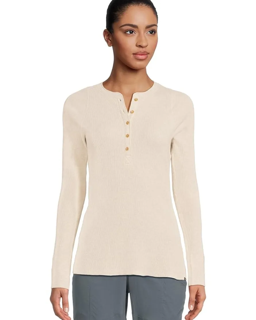 - A stylish and versatile tee, the prAna® Touchstone Henley features long sleeves and a classic, relaxed fit. It has rib-knit cuffs for a snug fit at the wrists. The front placket is adorned with five buttons, offering a customizable neckline. The back neck is accented with a sleek metal bar logo, adding a touch of sophistication to the overall design.