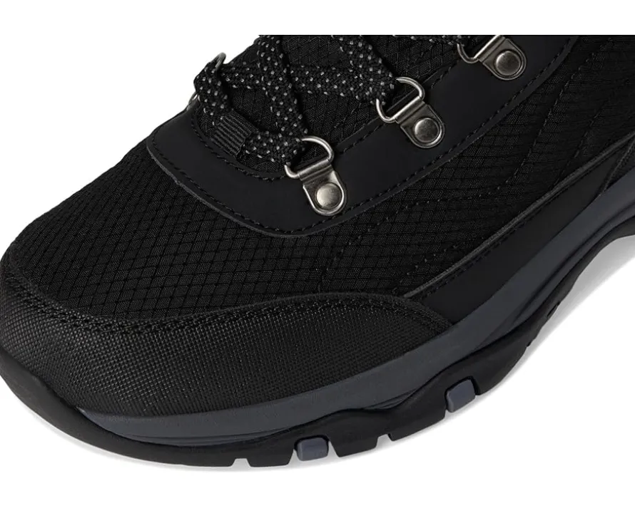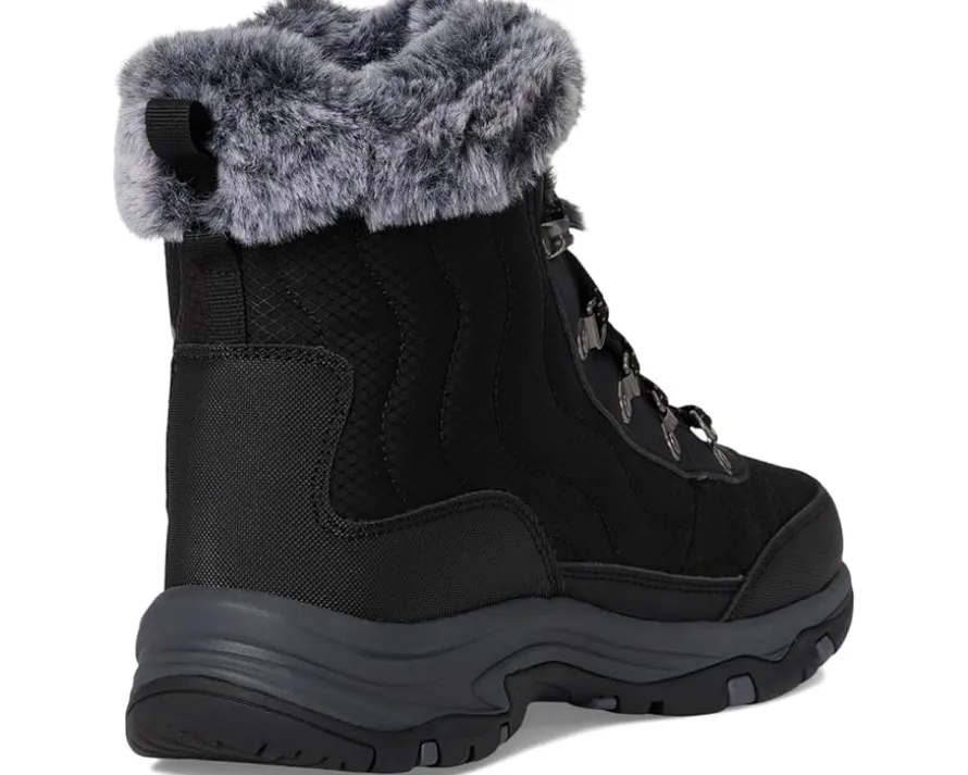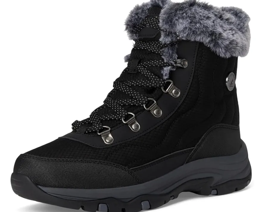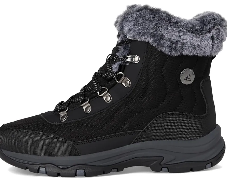 - Keep it cozy this season in rugged comfort wearing the SKECHERS® Trego – Stormie. The lace-up hiking boots feature waterproof synthetic and mesh upper, faux-fur lined trim and Skechers Air-Cooled Memory Foam® cushioned comfort insole. The ankle-high shoes have fabric lining, waterproof seam-sealed design, and round toe design.