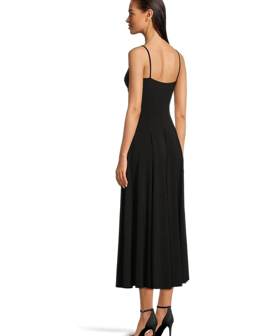 - Sleeveless gown flaunts a drapey matte stretch jersey fabrication.