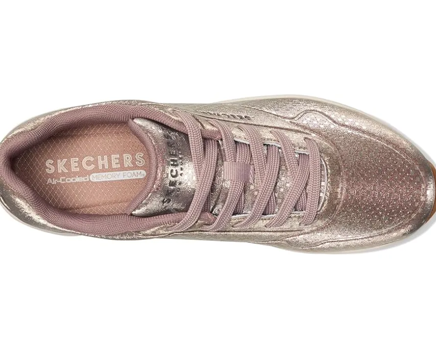 - Step into the groove with SKECHERS® Uno – Disco Nite, a fashion-forward sneaker that blends retro sparkle with modern comfort. This lace-up style features a synthetic disco glitter upper that catches the light with every move, while the Skechers Air-Cooled Memory Foam® insole delivers breathable cushioning and pressure relief. The standout Skech-Air® visible airbag midsole adds a cloud-like bounce to your stride, complemented by a flexible rubber traction outsole for everyday grip.