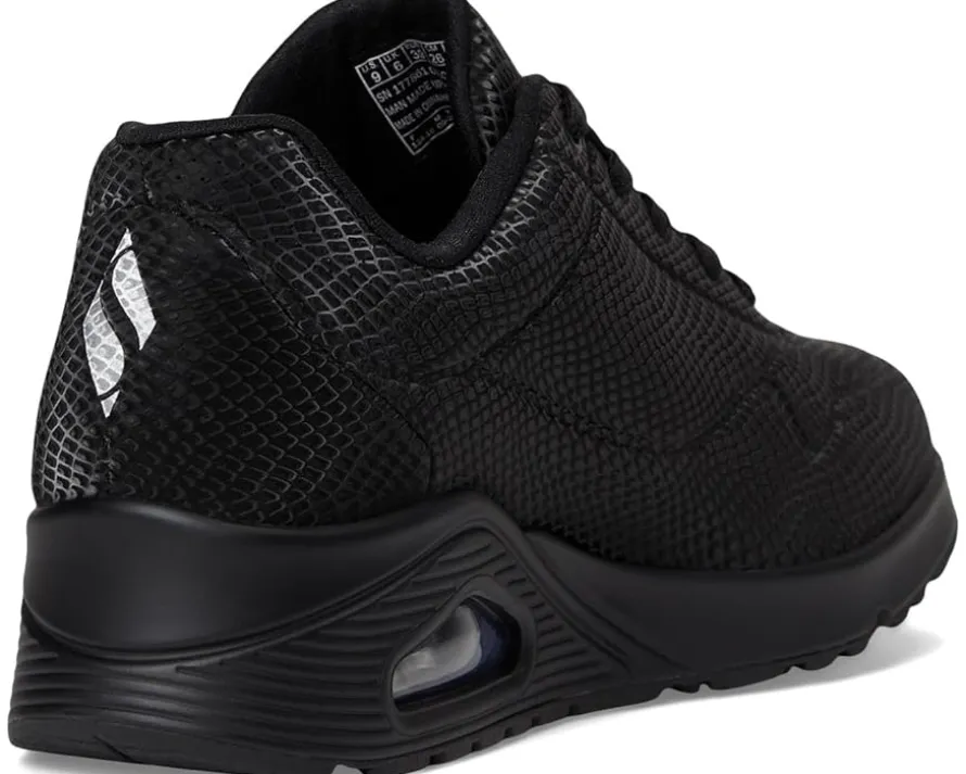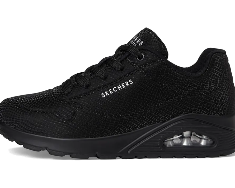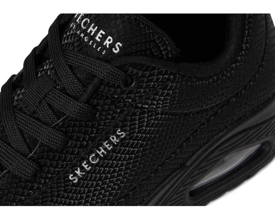 - Step into the groove with the SKECHERS® Uno – Shiny Scale shoes. These fashion sneakers feature a lace-up polyurethane reflective upper, Skechers Air-cooled Memory Foam® insole, and a visible, air-infused Skech-Air midsole that gives you the feeling of walking on clouds, everywhere you go. The polyester lining offers added comfort. Experience cushioning and exceptional support with their signature comfort technology. Take to the air in a variety of lightweight styles and comfortable cushioning you can feel with these lace-up sneakers.