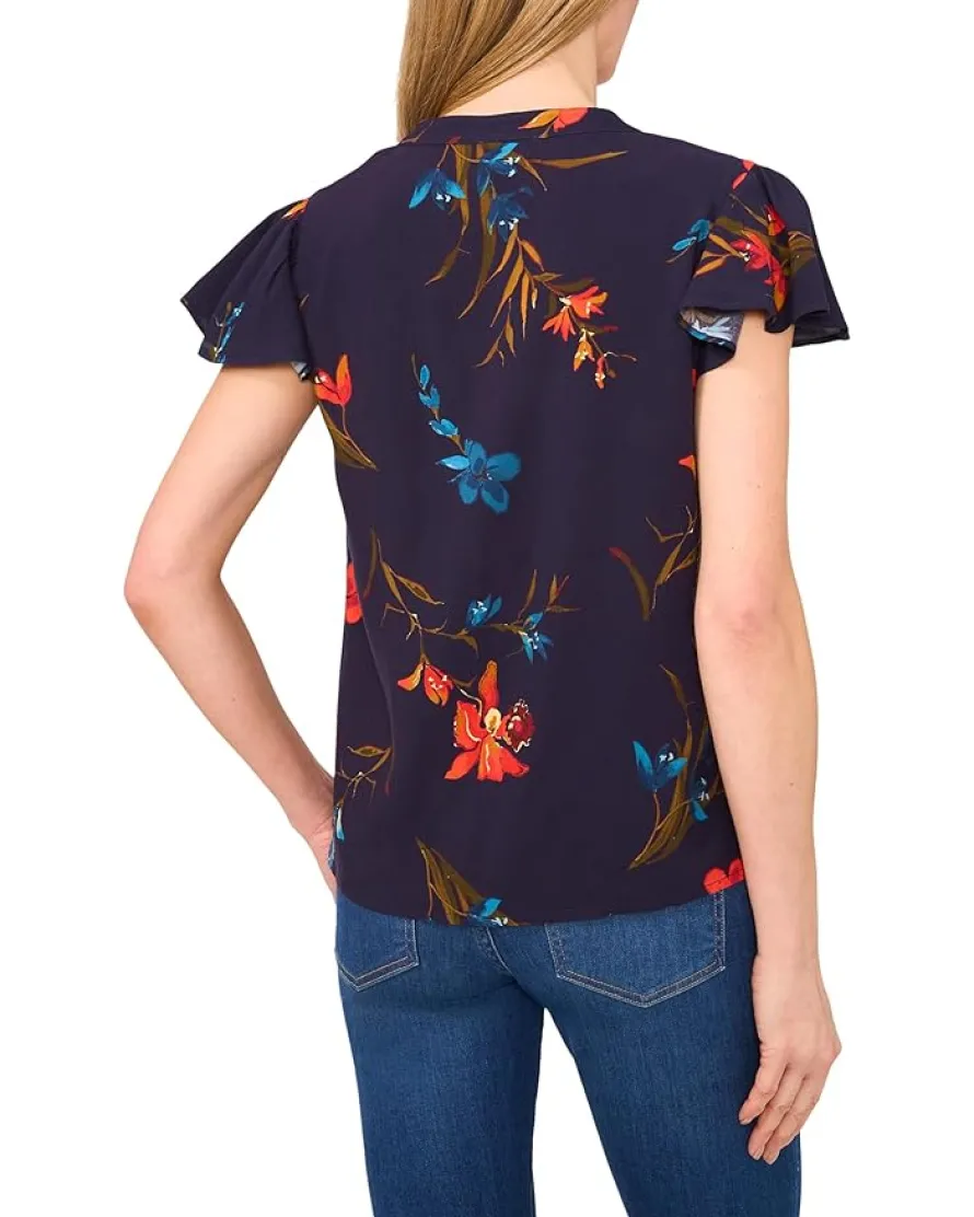 - Effortlessly feminine, the CeCe™ V-neck Shirred Neck Flutter Sleeve Blouse features a delicate shirred neckline and flutter sleeves for a soft, flowy silhouette. The V-neck adds an elegant touch, while the viscose fabric provides superior comfort and breathability. Featuring an allover floral print, this printed top is perfect for both office wear and casual outings.