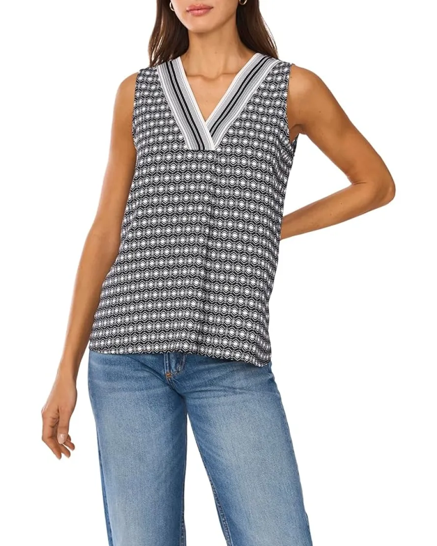- Stylish and comfortable, the Vince Camuto® V Neck Sleeveless Blouse makes a great addition to your wardrobe. It is styled with a V-neckline and a straight hem. This sleeveless blouse is made from polyester fabric that takes your comfort to the next level.
