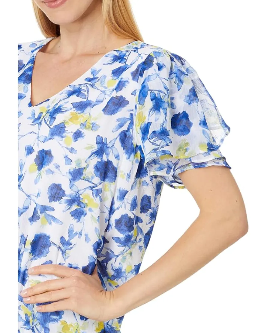 - Accentuate your attire with the subtle yet striking effect of Vince Camuto® V Neck Tulip Slv Blouse. It features a V-neckline, short flutter sleeves with slit, and allover floral print pattern.