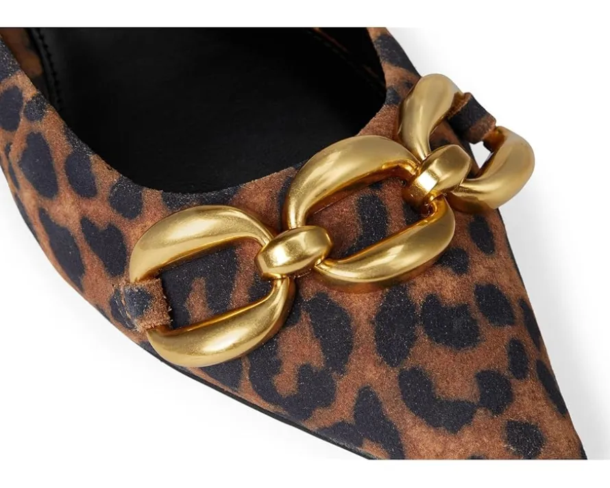 - Stride with sleek confidence styling in Vince Camuto® Valiey Chain Link Slingback Mule. Crafted with a faux leather upper and luxe gold-tone chain embellishment, these mules bring undeniable edge to any outfit. The sharply pointed toe creates a polished silhouette, while the low block heel gives you all-day wearability without sacrificing style. An adjustable buckle slingback ensures a snug fit, and the padded footbed keeps you comfy from day to night.