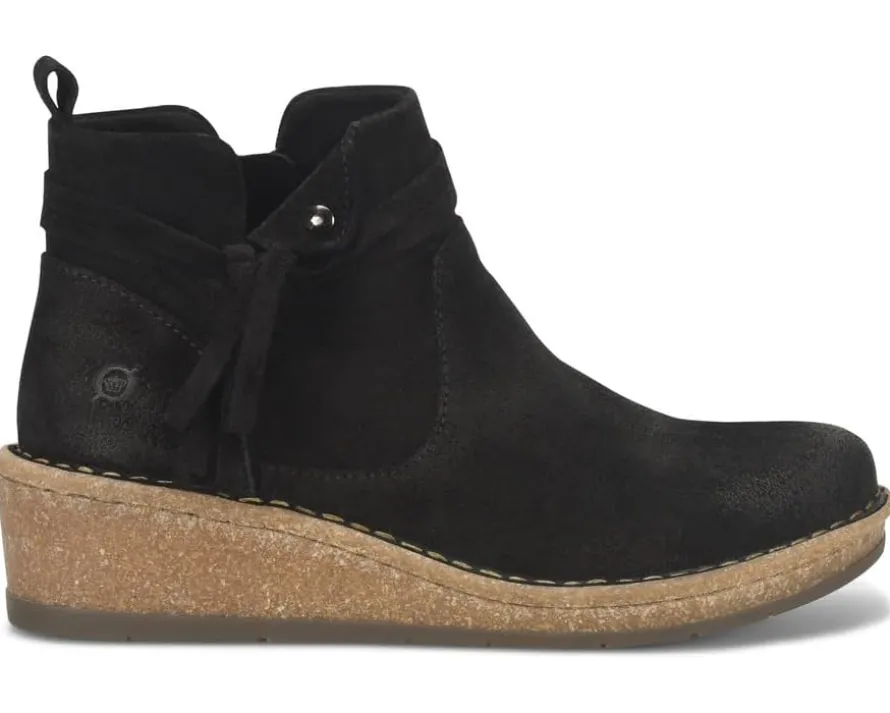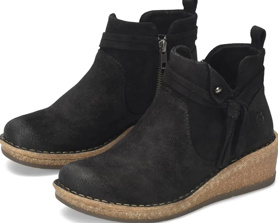 - The Born® Vaughn boots are designed to captivate with their unique details and provide a fashionable lift to your wardrobe. These boots feature Opanka hand-crafted construction that offers durability while the zippered side closure ensures easy on and off. The hand-finished distressed suede leather upper of these boots comes with a heel pull loop. These leather boots are crafted with a breathable soft fabric suede lining and soft fabric suede-covered footbed with extra foam for added comfort. Make a fashionable entry wherever you go wearing these zippered boots.