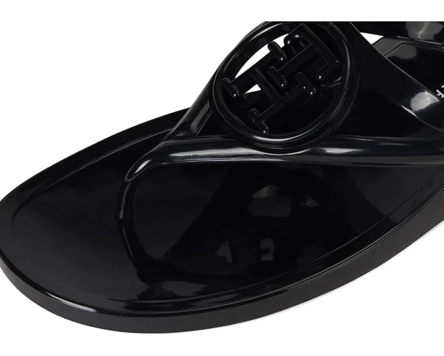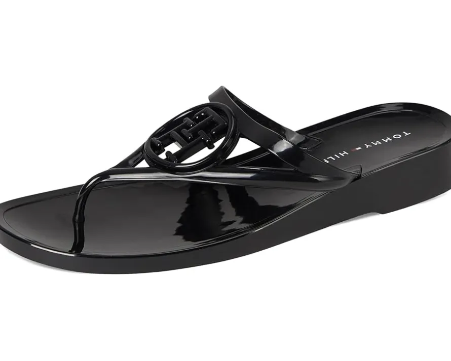 - The Tommy Hilfiger® Women’s Vedna jelly flip-flop with a low edge and instantly recognizable logo perfectly balances this signature style with a fresh attitude. Crafted from polyester upper, lining, and leather insole, this pair of sandals features open square toe, slip-on style, low-top silhouette, and brand detailing on the footbed.