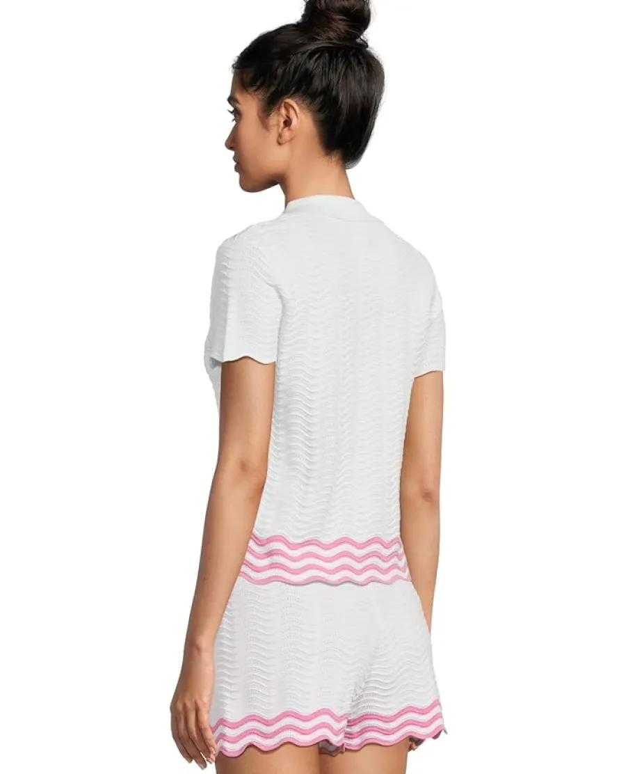 - The Beach Riot® Vera Top is a knit silhouette with scalloped edges and wave detailing. Designed to throw a flattering look, this pull-on top has a collared V-neckline and short sleeves.
