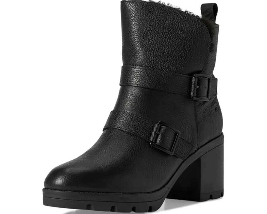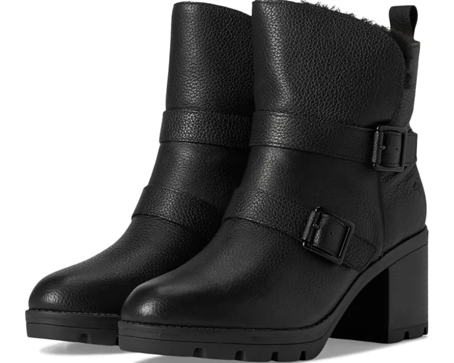 - Water-repellent ankle bootie with a fluffy lining, foldover topline and buckles.
