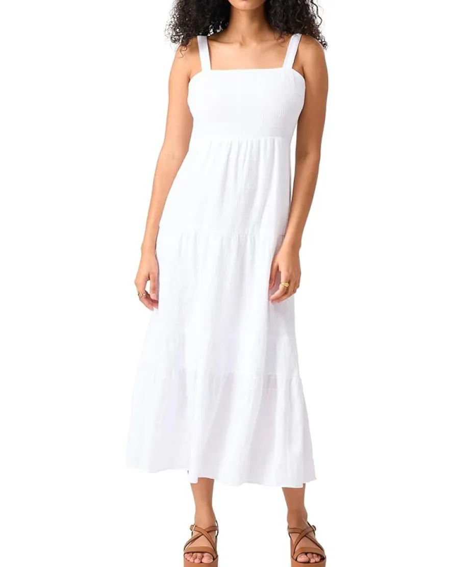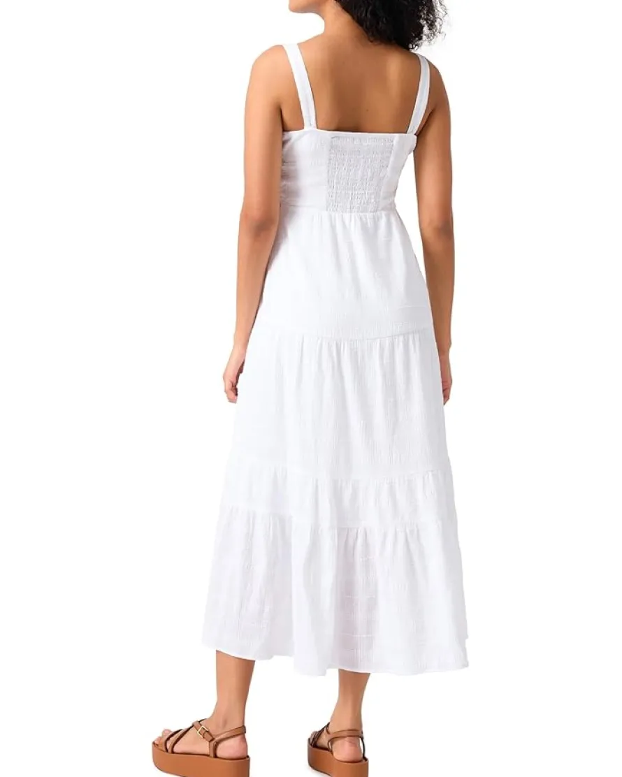 - Exhibit your natural, glossy, and stylish look wearing the Sanctuary® Watching Sunset Tiered Midi. This below-knee-length dress features square neckline, smock detailing on the back, and sleeveless construction.