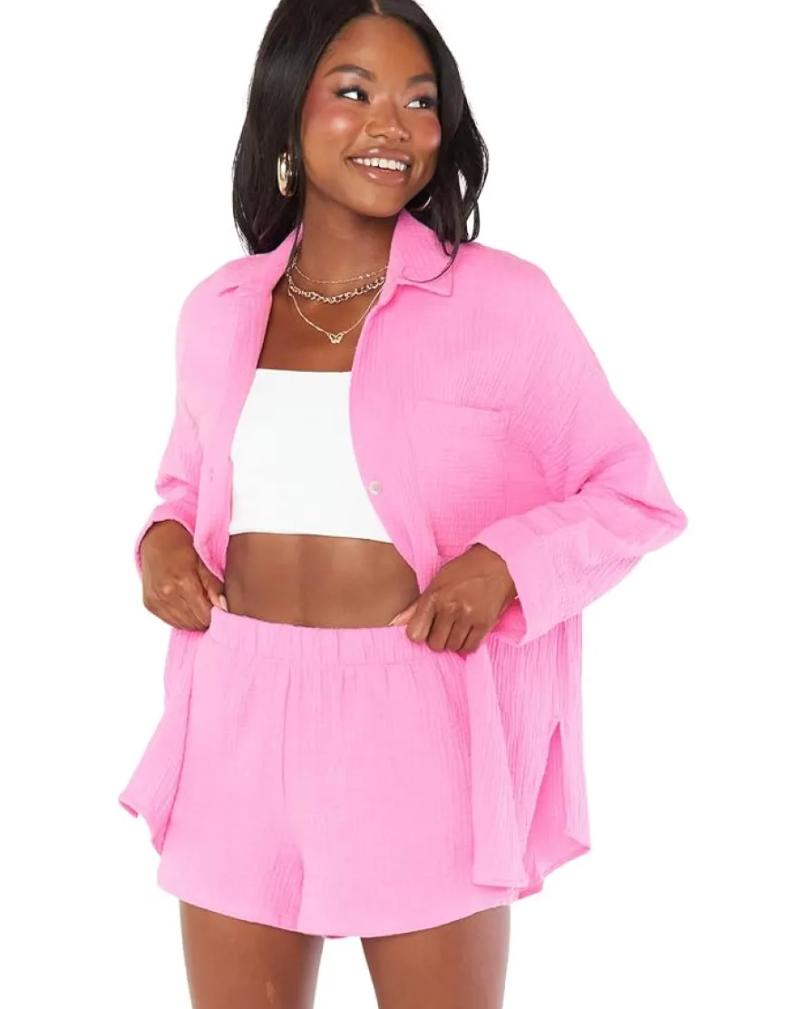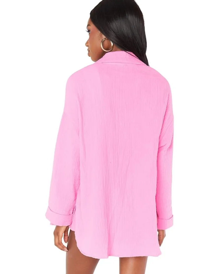- Style your pretty look in the soft and oversized gauze Show Me Your Mumu™ Weekday Button-Up shirt for a fun weekend this season.