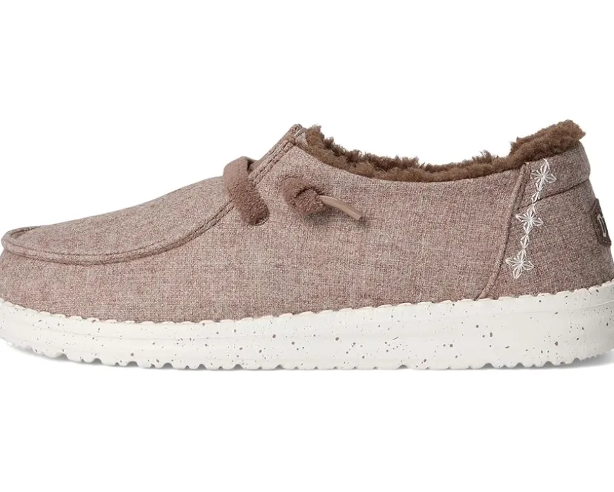 - The Hey Dude® Wendy Wool Cozy shoes are slip-on sneakers that are ready to roam. Their easy-on elastic laces offer a secure fit, while the polyester upper features a Flex & Fold design that supports healthy feet with their unique shape, giving complete freedom of movement. They are made of an EVA insole and a polyester lining.
