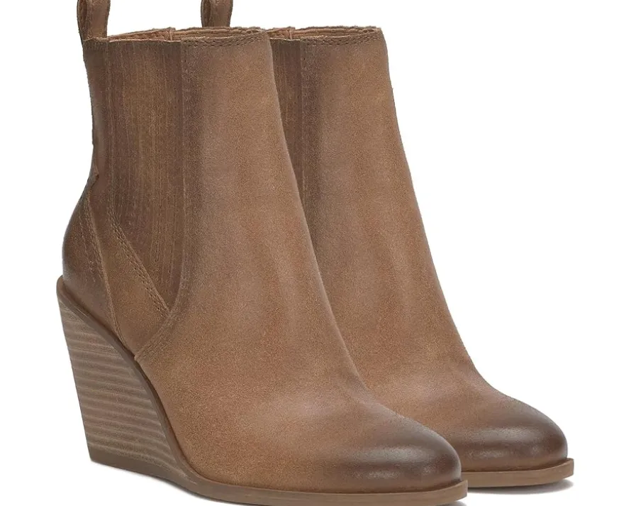 - Wedge bootie of the season! The Lucky Brand® Wilano has a burnished suede upper and exposed stack wedge heel, keeping this dressier silhouette casual and cool. The pull-on footwear features an ankle-high silhouette with pleated gore panels and heel pull tabs for easy wear.