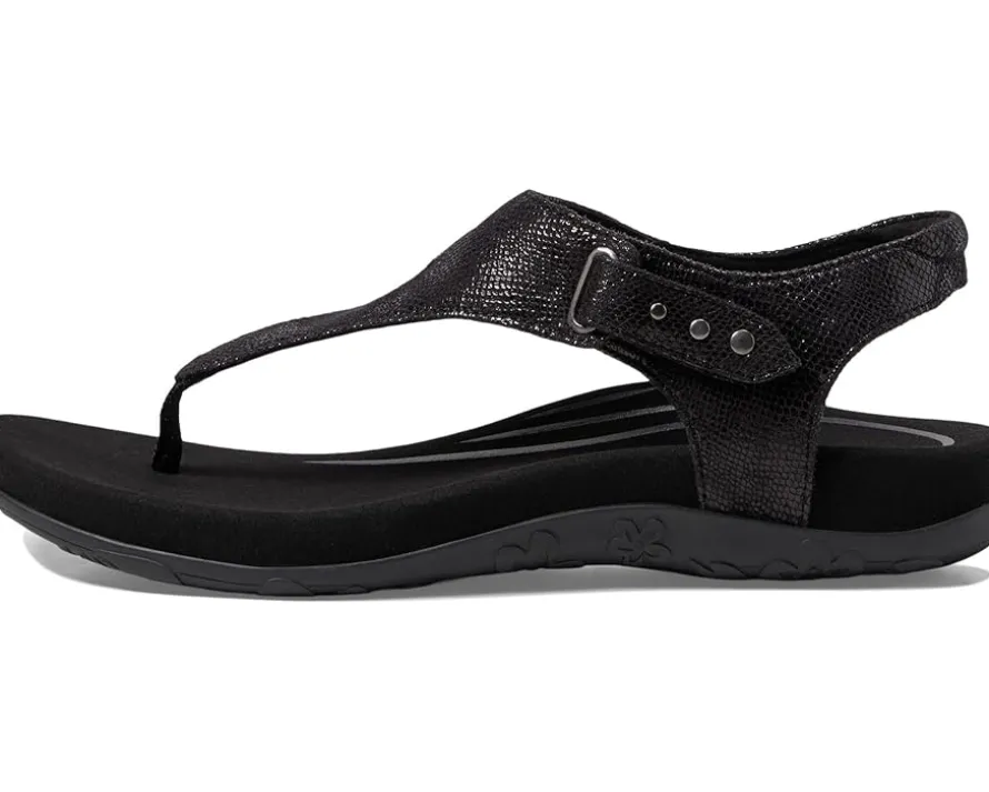 - The Aetrex® Ellie thong style sandals feature arch support that helps to stabilize and align feet, memory foam midsole, adjustable ankle strap buckle, and hook-and-loop closure. It has a faux leather upper.