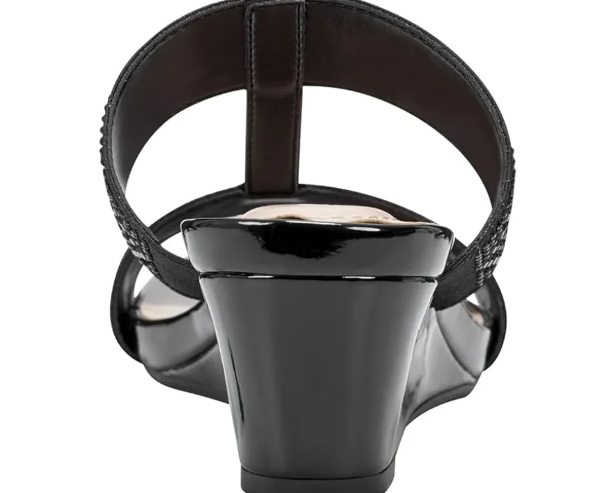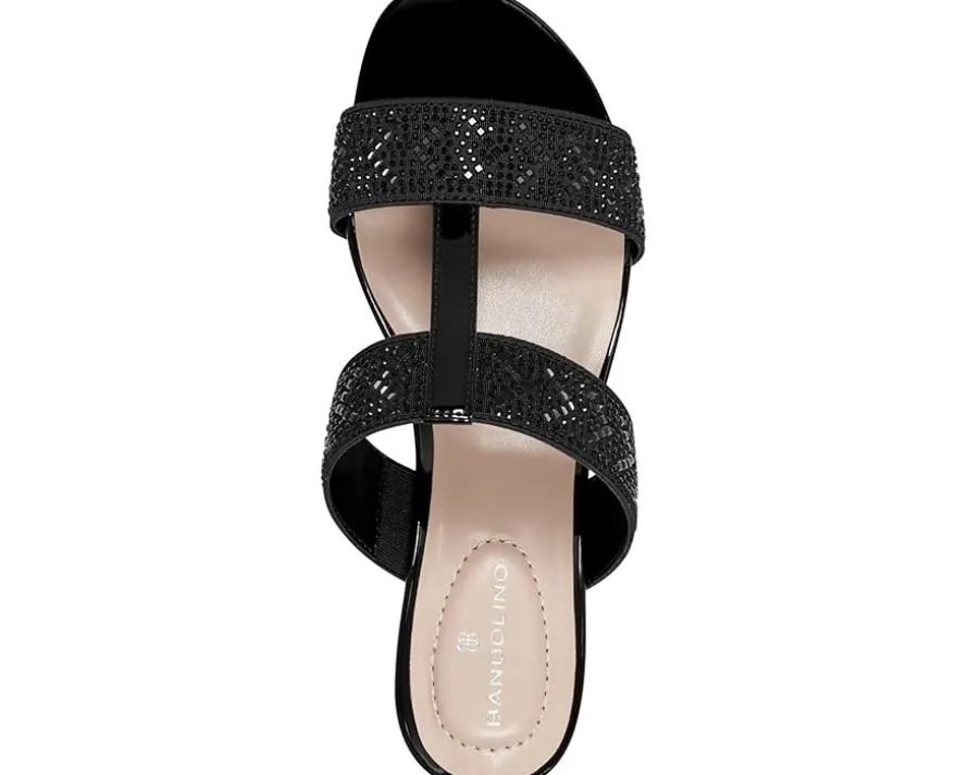 - Get set for the endless fun wearing the Bandolino® Iluvit. Crafted from PU upper, man-made lining, and foam insole, this pair of slip-on sandals features wedge heel, open round toe, crystal-encrusted double strap on the vamp, and brand detailing on the footbed.