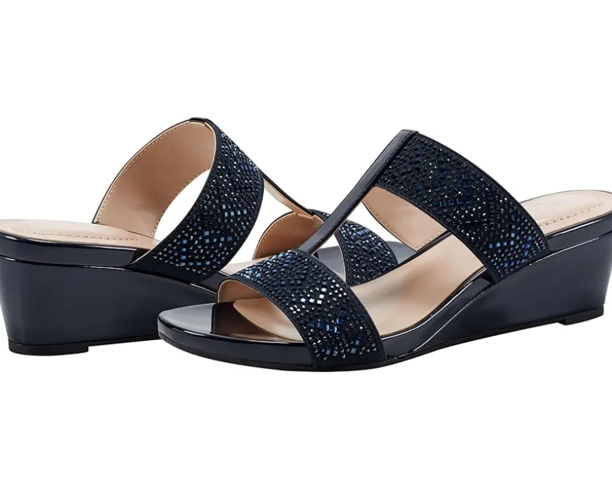 - Get set for the endless fun wearing the Bandolino® Iluvit. Crafted from PU upper, man-made lining, and foam insole, this pair of slip-on sandals features wedge heel, open round toe, crystal-encrusted double strap on the vamp, and brand detailing on the footbed.