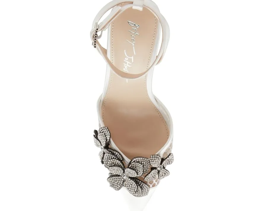 - Synthetic upper with mesh cutouts and rhinestone-embellished floral appliques.