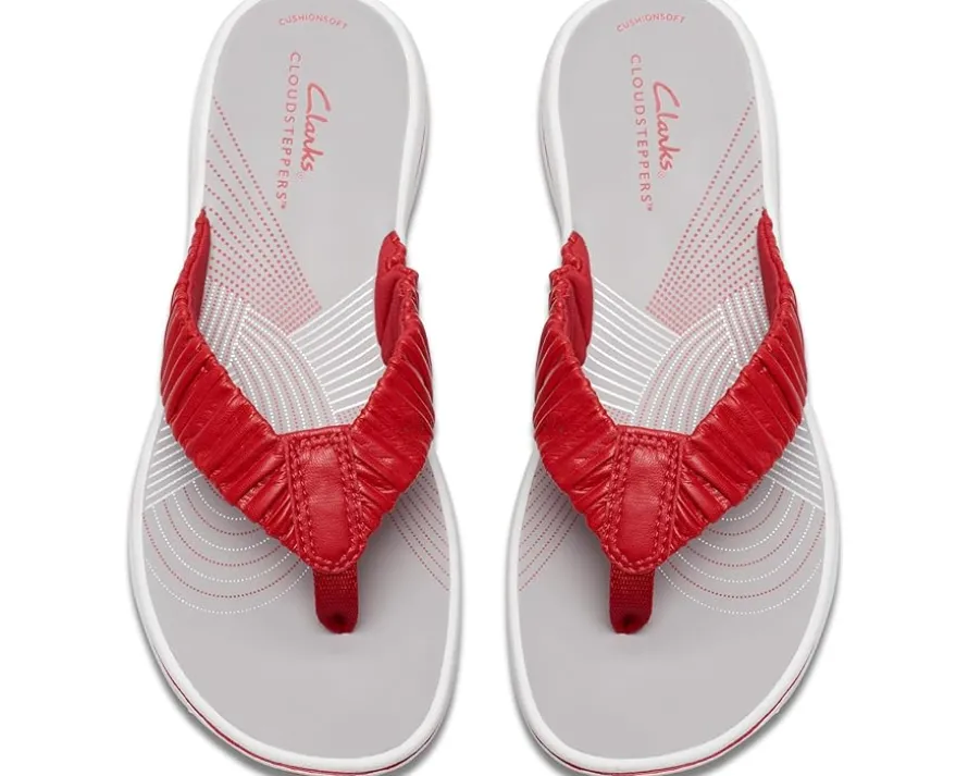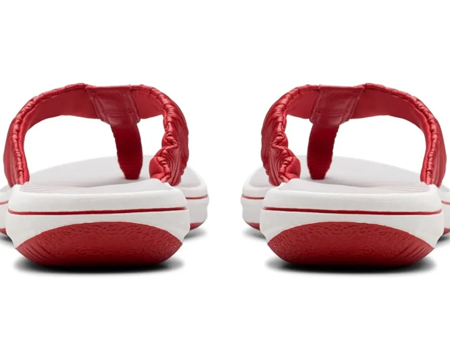 - Be classy and sassy donning the Clarks™ Breeze Rae. These thong-style flat sandals feature slip-on construction, nylon upper, and allover ruched detailing on the straps. Wear this flats with your shorts to get a modish look.