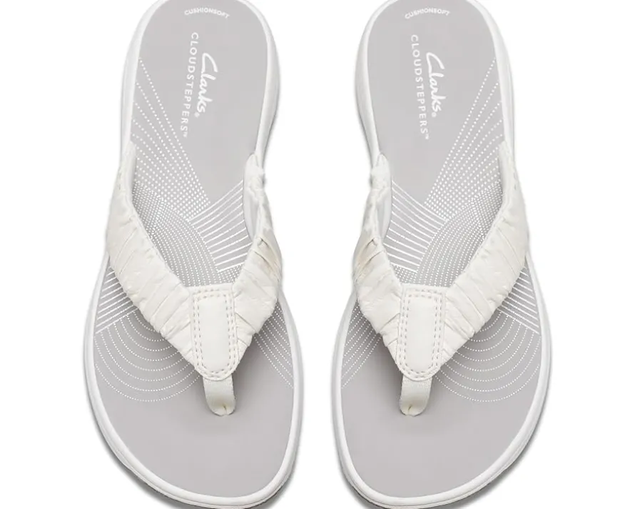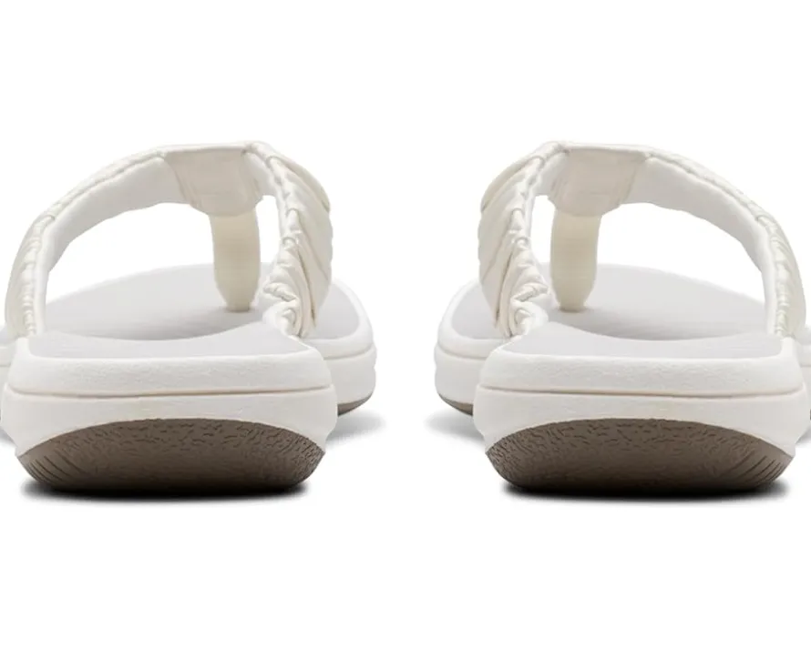- Be classy and sassy donning the Clarks™ Breeze Rae. These thong-style flat sandals feature slip-on construction, nylon upper, and allover ruched detailing on the straps. Wear this flats with your shorts to get a modish look.